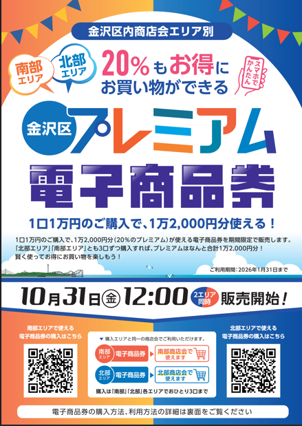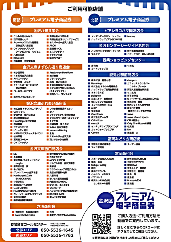 10月31日より金沢区プレミアム電子商品券の販売が開始されます。すずらん通り商店会でも下記参加店舗におきまして、南部エリアのプレミアム電子商品券がご利用いただけます。(ご利用期間は2026年1月31日まで)。利用条件等につきましては各店舗に直接お問い合わせください。