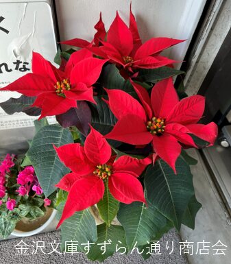 商店会が緑いっぱいになりました。また、一部店舗でポインセチアが配布され、店先に飾らております。