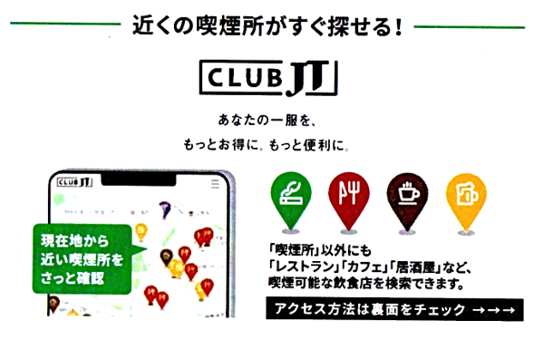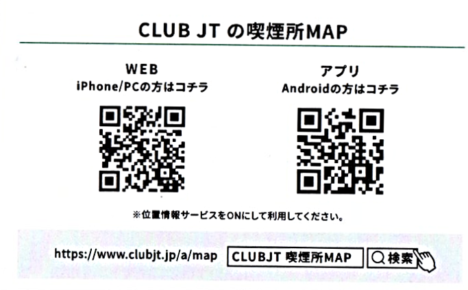 ※喫煙所は商店会内パチンコ店「スリーエイト」さんの裏側に喫煙スペースがございます。また当店近隣の喫煙可能な店舗等のマップについては下記のCLUB JTのホームページよりご確認いただけます。