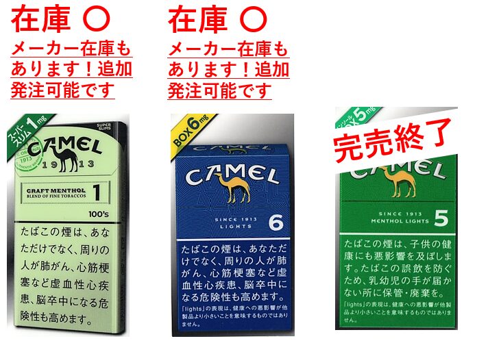 上記、JT製品で廃番となる「ウィンストンキャビンレッド2ミリ」、「ウィンストンキャビンレッド8ミリ100s」「ウィンストンキャスターホワイト1ミリBOX」、「キャメルクラフトメンソール1ミリ100sスリム」、「キャメルライトBOX」について、当店ではまだ在庫がございます!