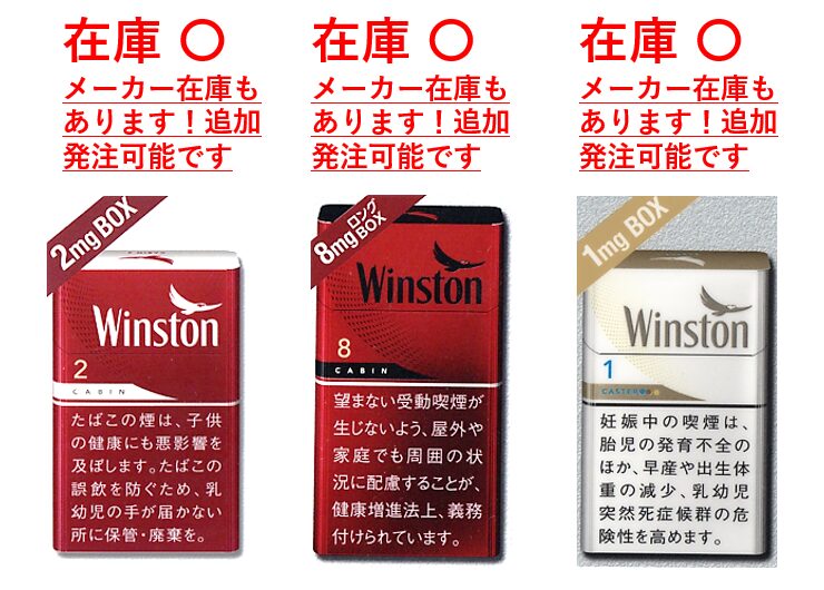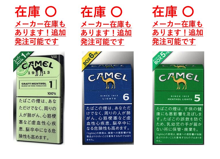 上記、JT製品で廃版となる「ウィンストンキャビンレッド2ミリ」、「ウィンストンキャビンレッド8ミリ100s」「ウィンストンキャスターホワイト1ミリBOX」、「キャメルクラフトメンソール1ミリ100sスリム」、「キャメルライトBOX」、「キャメルメンソールライトBOX」について、当店ではまだ在庫がございます!