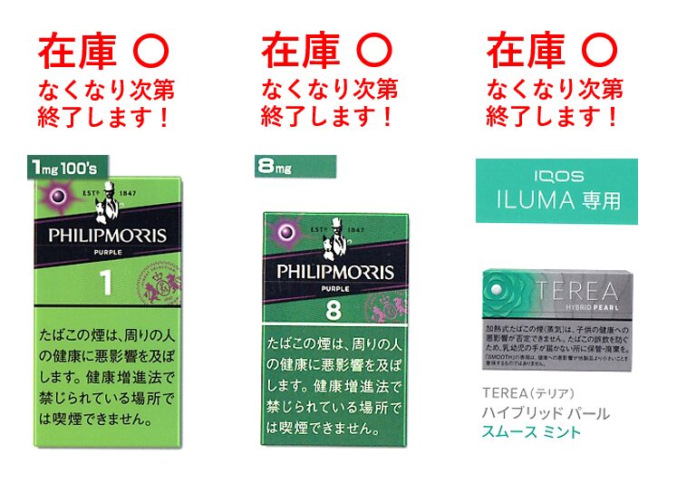 上記、外国たばこ製品で廃版となる「フィリップモリス1ミリ100sスーパースリムBOX」、「フィリップモリスパープル1ミリ100sスーパースリムBOX」、「アークロイヤルワイルドカード」、「フィリップモリスパープル1ミリ100sBOX」、「フィリップスパープル8ミリBOX」、「テリアハイブリッドパールスムースミント」について、当店ではまだ在庫がございます!