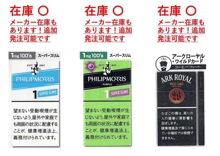 上記、外国たばこ製品で廃番となる「フィリップモリス1ミリ100sスーパースリムBOX」、「フィリップモリスパープル1ミリ100sスーパースリムBOX」、「アークロイヤルワイルドカード」、「フィリップモリスパープル1ミリ100sBOX」、「フィリップスパープル8ミリBOX」、「テリアハイブリッドパールスムースミント」について、当店ではまだ在庫がございます!
