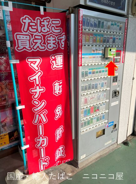 ニコニコ屋では2台導入している自販機の両方でマイナンバーカード、免許証による認証でたばこを購入することが可能です。タスポカードをお持ちでない方も24時間たばこを購入することが可能です。ぜひご利用ください。