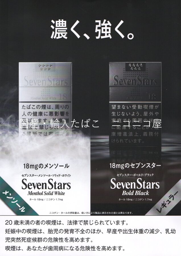 コンビニやスーパーではまず見かけない、強いセブンスター(18ミリ)が入荷いたしました。セブンスター・メンソール・ソリッド・ホワイト、セブンスター・ボールド・ブラック各600円になります。たばこ葉がぎっしり詰まった国産のタバコです。アメリカンスピリット等がお好きな方にはとてもお勧めです!店内だけでなく、自動販売機にも入っております。ぜひこの機会にお買い求めください。